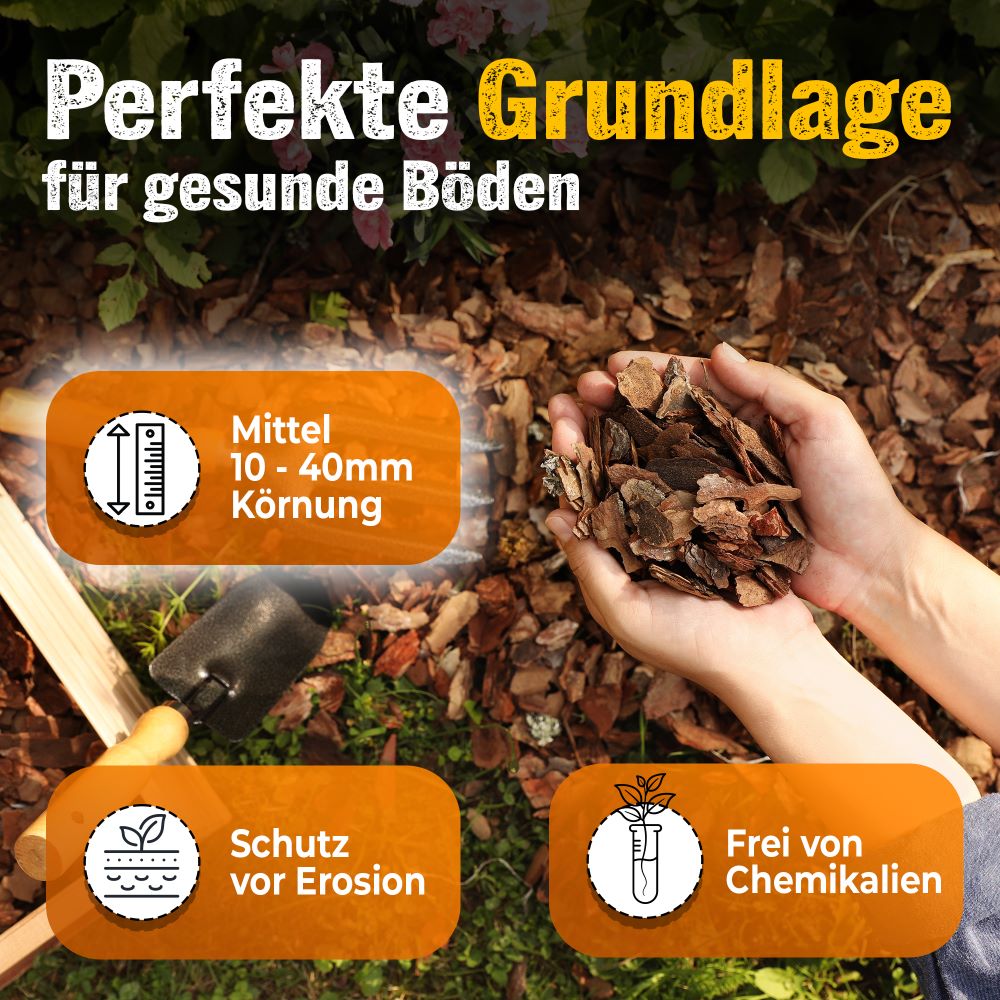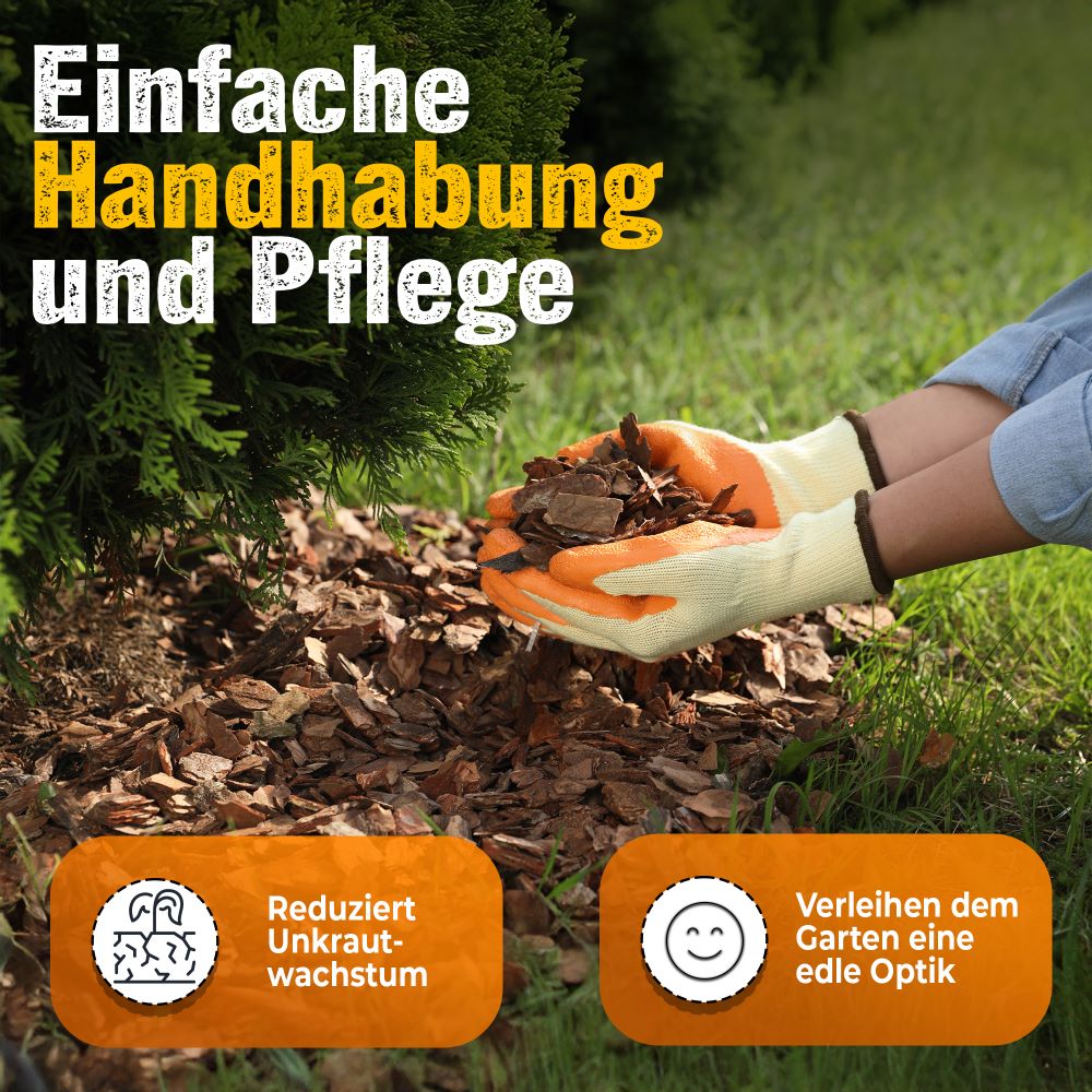 Die warme, natürliche Farbgebung der Rinde fügt sich harmonisch in jede Gartengestaltung ein – perfekt für Beete, Sträucher, Wege und Grünanlagen.